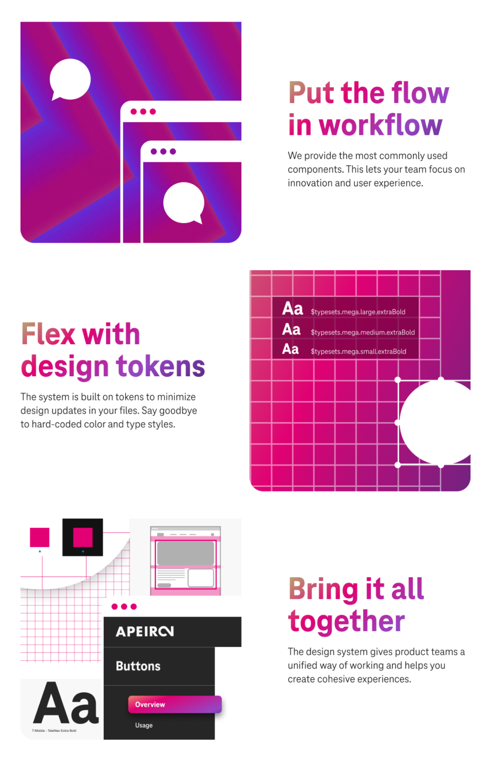 After identifying issues in the existing design system, we developed a new design structure of foundations, components, and tokens to offer a unified framework for T-Mobile's products and platforms, addressing the shortcomings of the old design system.