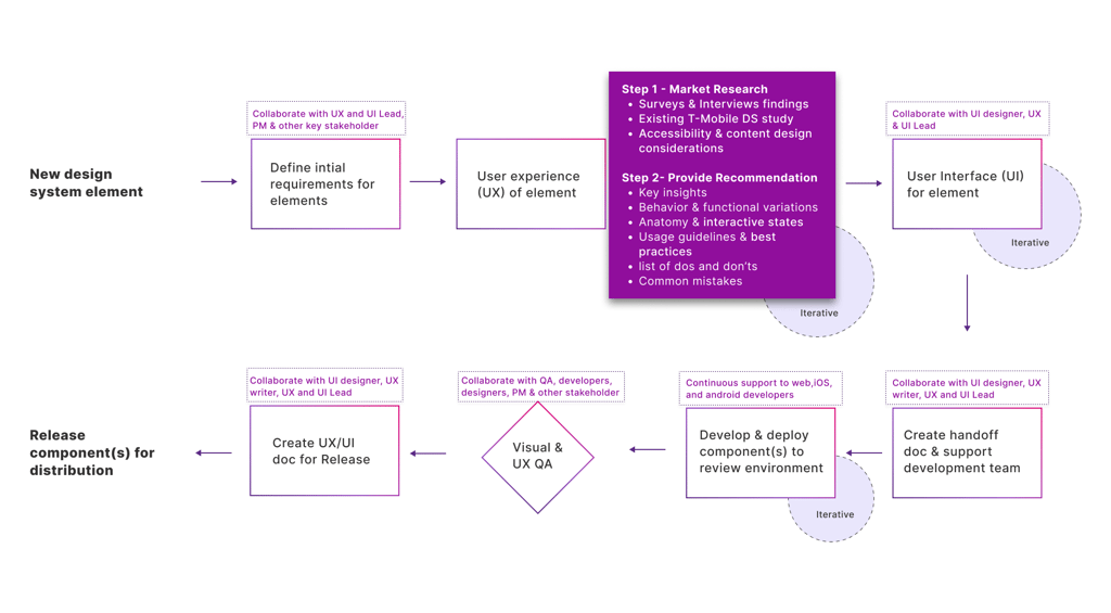 The UX design process starts with selecting a new element to be included in our design system. After establishing the initial requirements, I delve into research. This step involves conducting surveys and interviews, observing how team members use existing design systems at T-Mobile, and studying existing design systems in the market. Additionally, I research how this element functions across different platforms, such as web, iOS, and Android. I also dive deep into the Accessibility recommendations for each component.