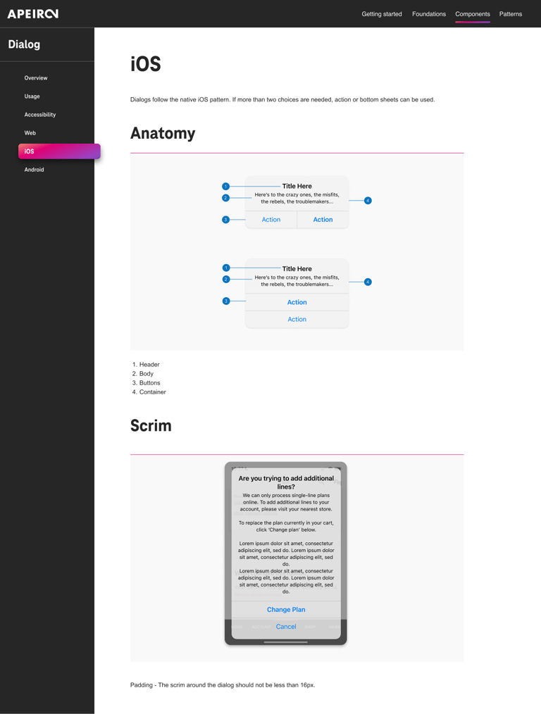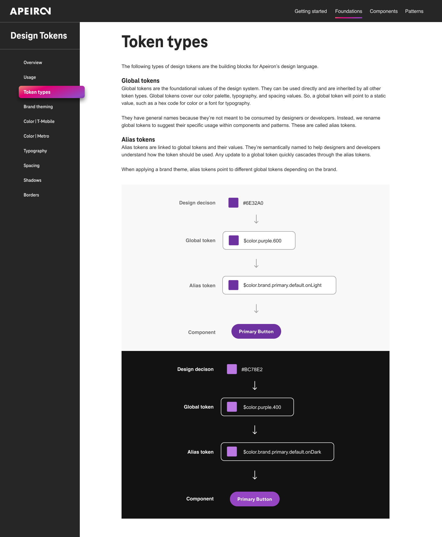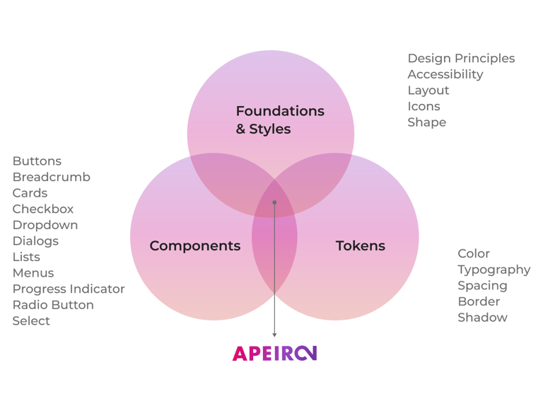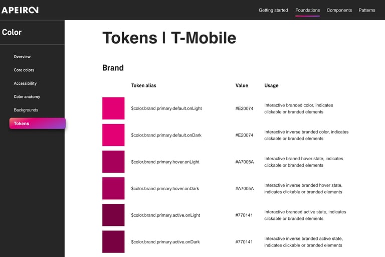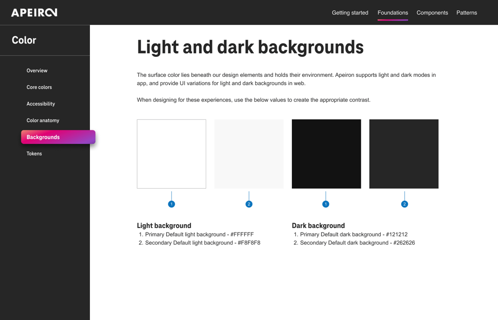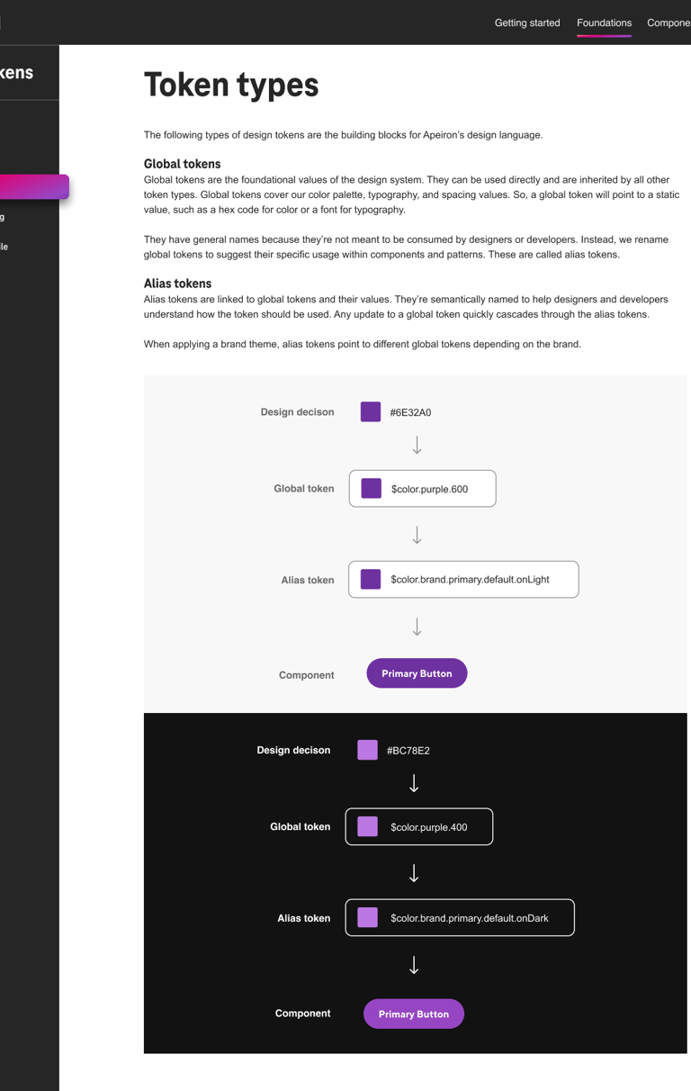 Design tokens are the source of truth for the foundational decisions in the Apeiron Design System. Tokens translate into readable styles for all digital platforms. We use tokens in place of hard-coded values, such as hex values for color or pixel values for spacing. A design token only needs to be changed in one place to see the effect system-wide.