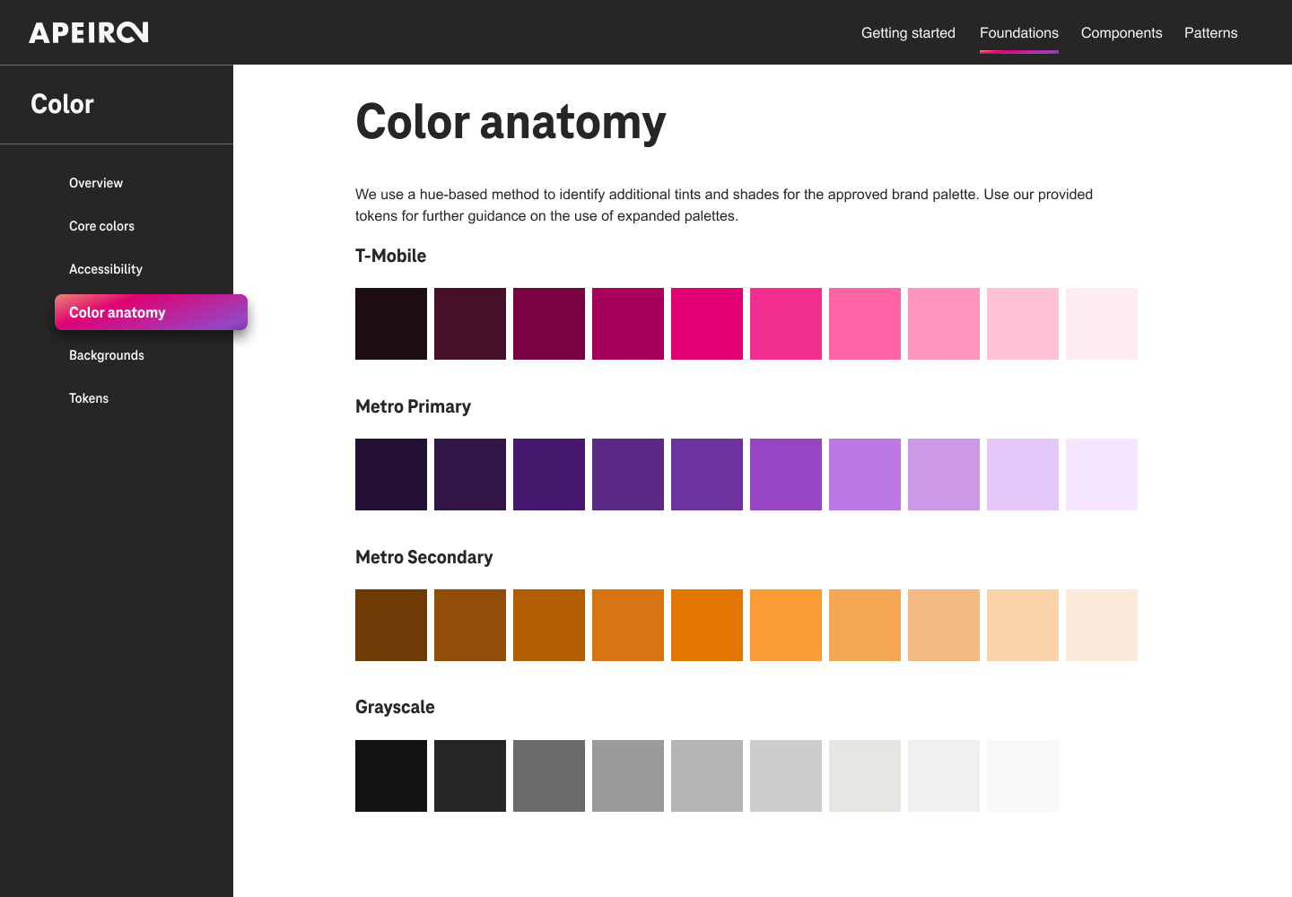 The color shows the meaning, creates consistency, and unifies platform experiences. The primary T-Mobile color is magenta. You can combine it with white, black, and gray. The neutral gray family is dominant in default themes, with subtle value shifts to organize content into sections. Metro uses purple as a primary color and gold as a secondary color. When creating schemes, use the same white, black, and gray colors as T-Mobile. We use a hue-based method to identify additional tints and shades for the approved brand palette.