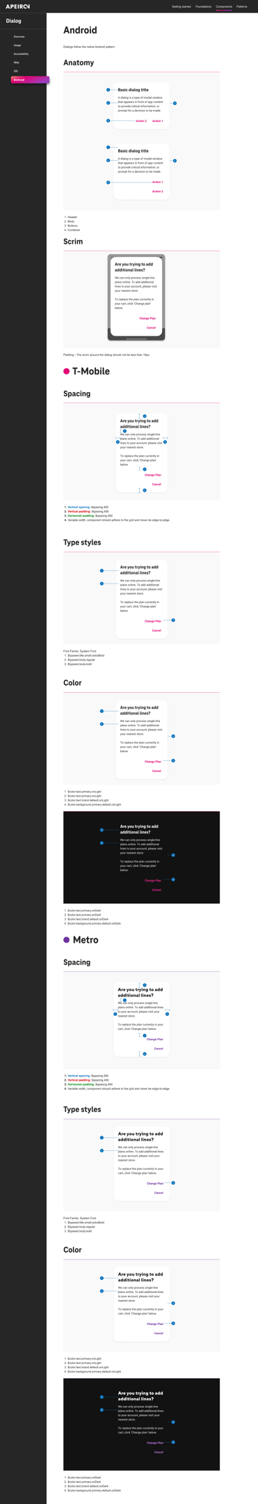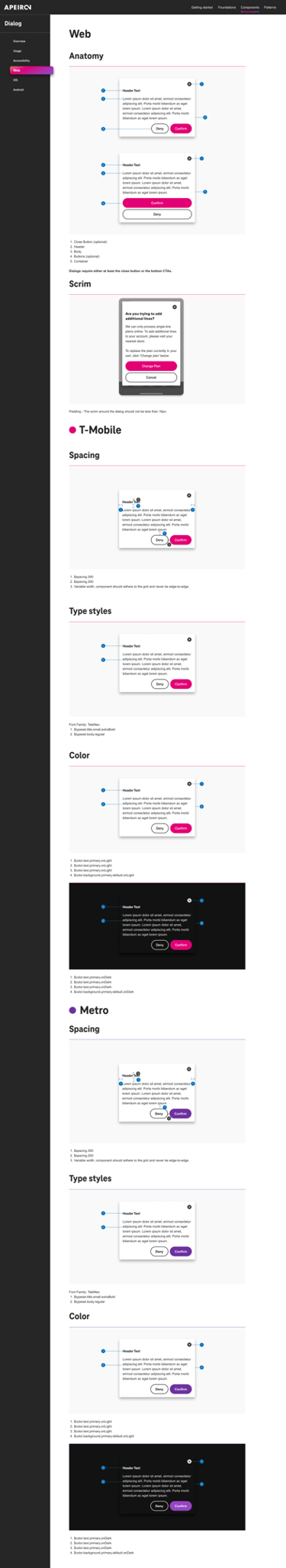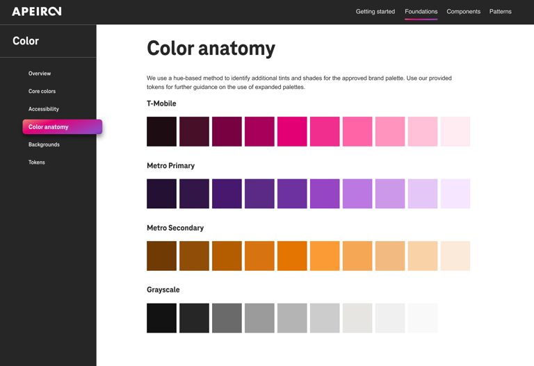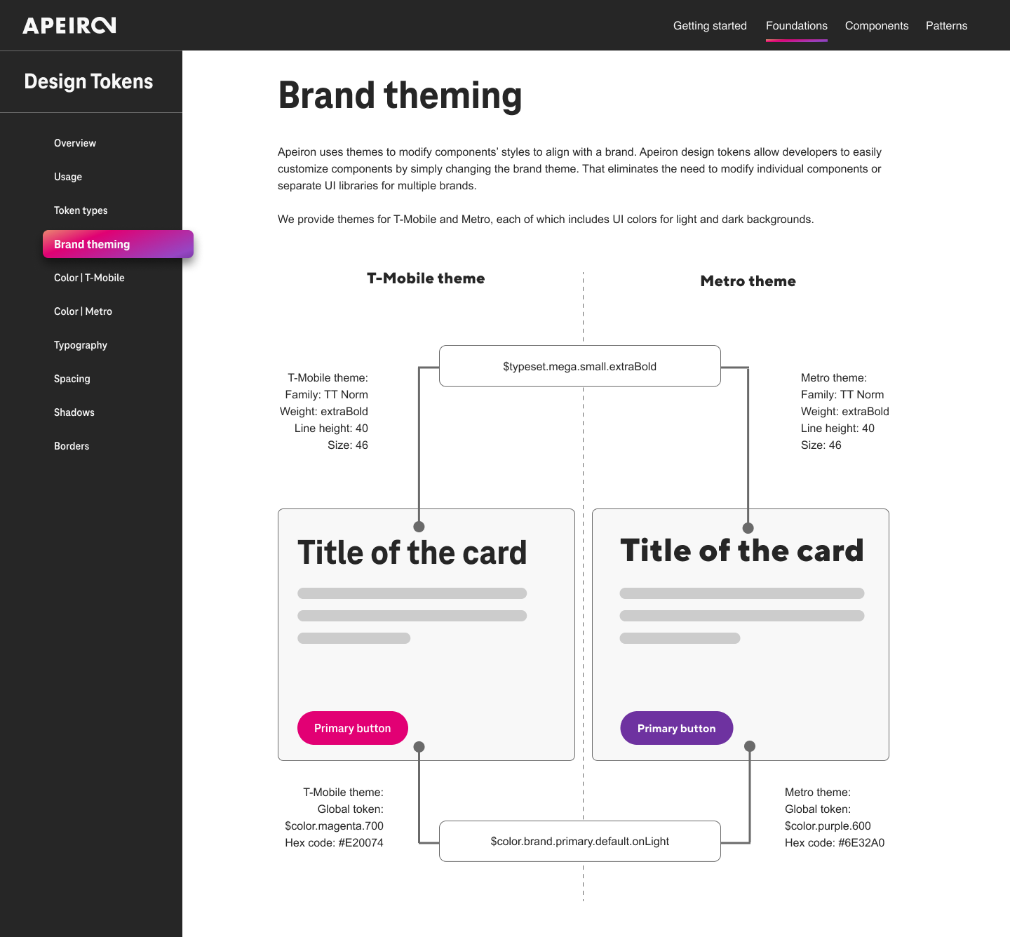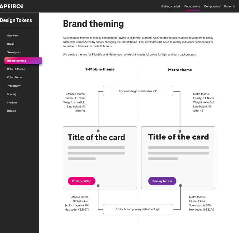 Apeiron uses themes to modify components’ styles to align with a brand. Apeiron design tokens allow developers to customize components easily by changing the brand theme. That eliminates the need to modify individual components or separate UI libraries for multiple brands. We provide themes for T-Mobile and Metro, including UI colors for light and dark backgrounds.