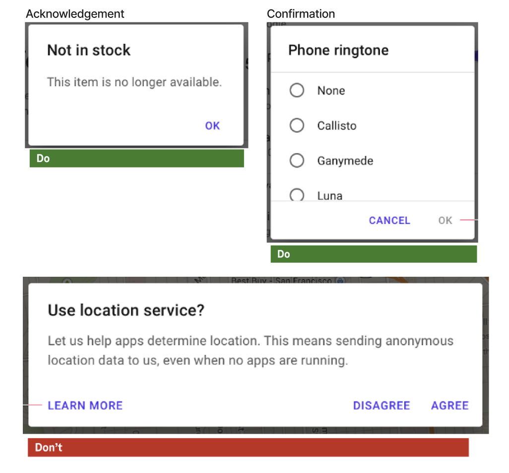 Dialogs can have buttons side-by-side, and stacked in full width.