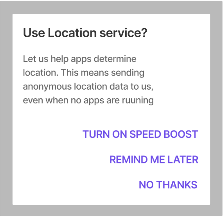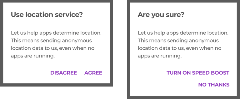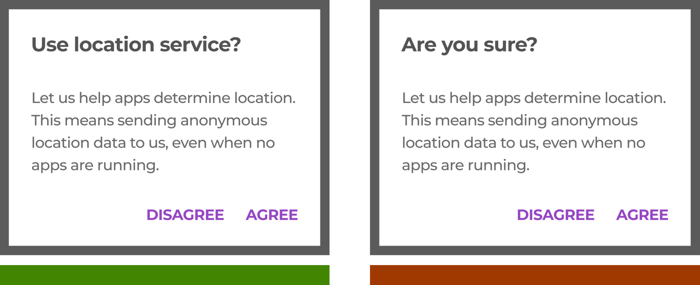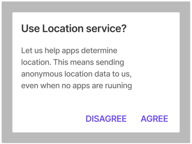 A dialog’s purpose should be communicated by its headline, buttons, or actionable items.