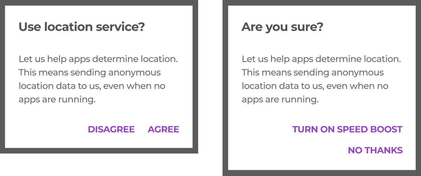 If the user’s ability to dismiss a dialog is disabled, the user must choose a dialog action to proceed.