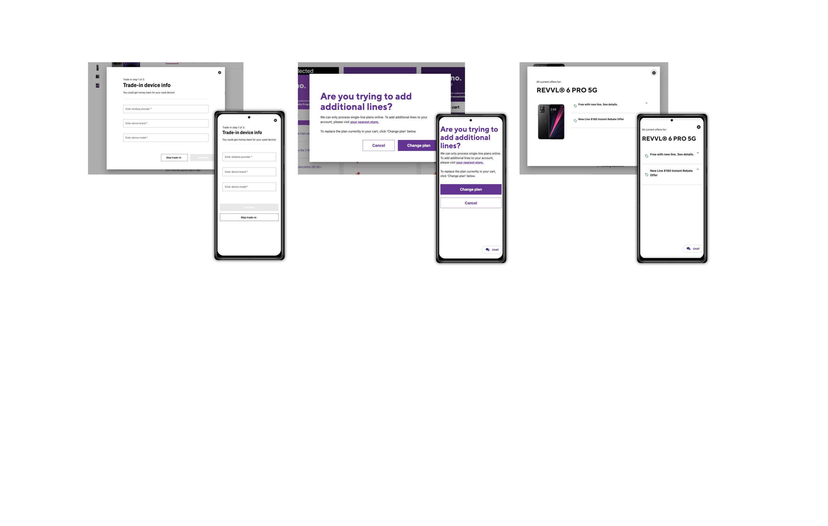 Next, I conducted a thorough analysis of T-Mobile's websites and apps to understand their use of dialogs. I captured a few screenshots of examples of existing T-Mobile use cases for these interactive elements.