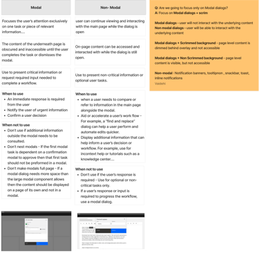 Next, I collected screenshots of the UI element from top design systems to understand their approaches and compiled a list of its common variations and functionalities. This process offered insights into industry best practices and diverse application possibilities for Dialogs, guiding our design strategy.