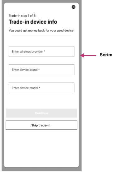 This scrim indicates the dialog is an overlay on top of the existing page rather than a new page, helping to distinguish it from the rest of the content and maintain the modal dialog context. The design suggests that users should perceive it as an interruptive element that demands interaction before returning to the main content, which is consistent with how modals should function on mobile devices.