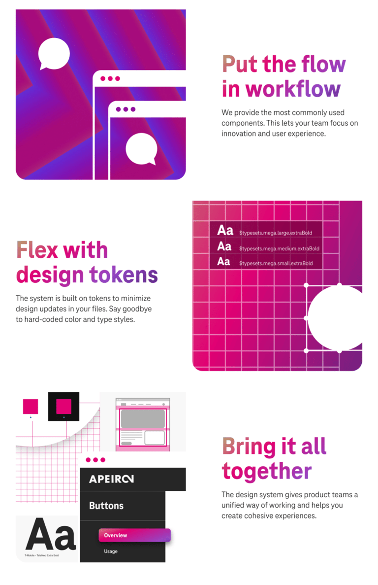 T-Mobile lacked a formalized design system. They had multiple internal design systems that operated separately for different products, with individual teams creating their own standards for UI elements, components, or modules. This fragmentation in the design process among product teams led to a lack of cohesive brand identity.