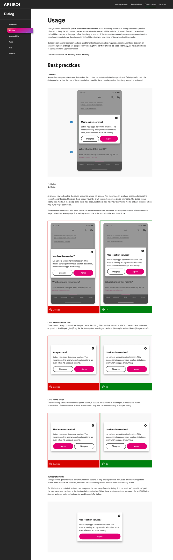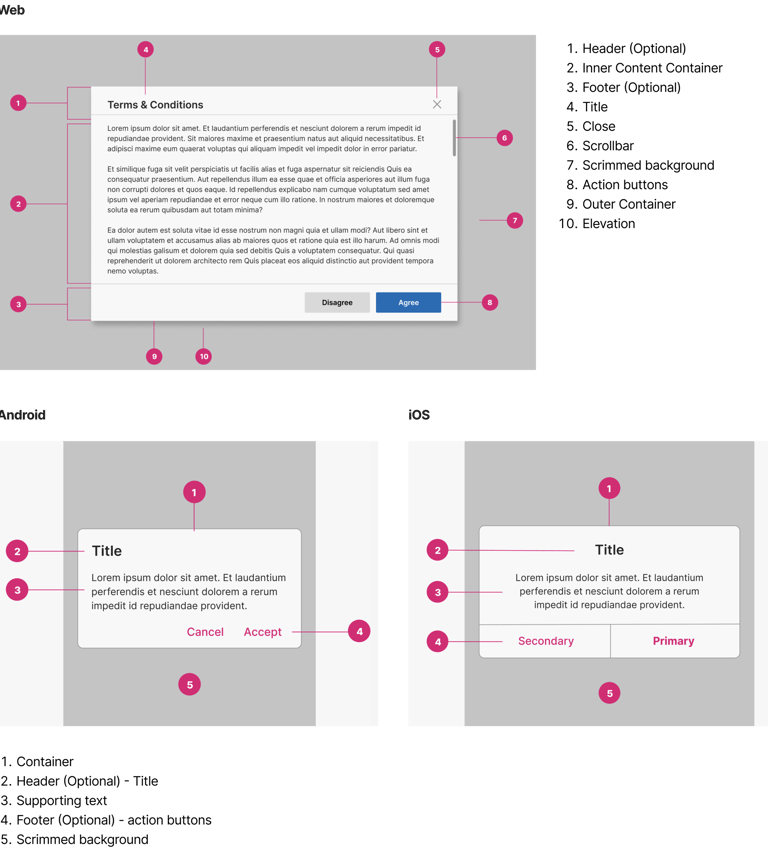 Based on the initial research and analysis (step 1), I've provided recommendations for the Dialog component's design and functionality that apply to a range of platforms and screen sizes. I have also clearly explained this UI element, its typical use, and sometimes a list of dos and don'ts for additional context and clarification. Visual examples are included to ensure a clear understanding of the discussion. Additionally, there are rules specifying when and how to use the component.