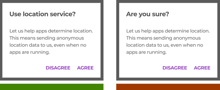 If two actions are provided, one must be a confirming action and the other a dismissing action. Disable confirming actions until a choice is made. Dismissive actions are never disabled.