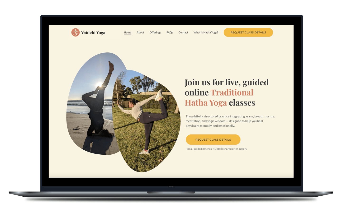 No pricing on the homepage, no urgency copy. Urgency copy — "Only 3 spots left!" — attracts the kind of decision that doesn't hold up when someone realizes this is a committed, philosophical practice rather than a drop-in fitness class.