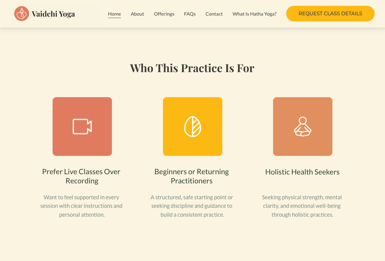 Multiple CTAs create friction through choice. More importantly, "Request Class Details" rather than "Sign Up Now" signals the enrollment process is considered, not impulsive. That framing filters for students who are serious, which is exactly who this practice is for.