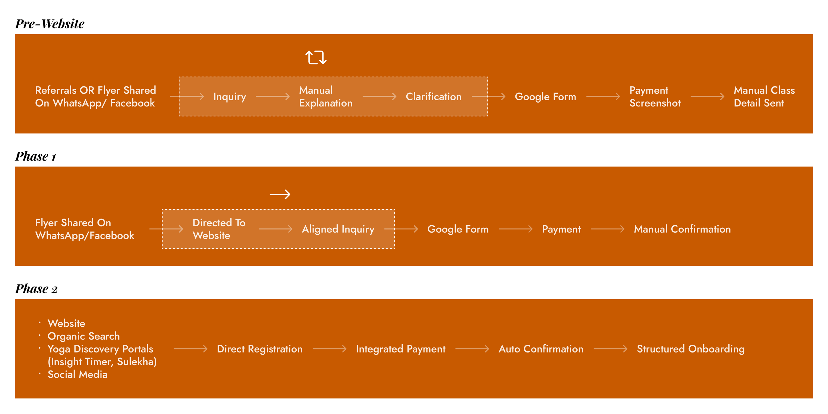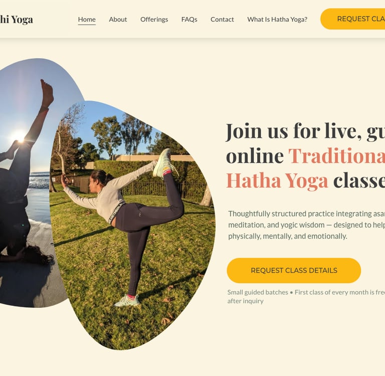 A live yoga service with 15–20 students and strong retention, but onboarding happened entirely via WhatsApp, every inquiry required 20+ minutes of manual explanation, and growth was capped by the founder's bandwidth.